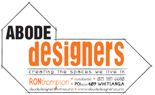 • Ron Thompson : mob 021 185 6680 / abode.designers@xtra.co.nz / PO Box 409, Whitianga 3542 / 1047 Tairua-Whitianga Road, Whenuakite RD1, Whitianga 3591